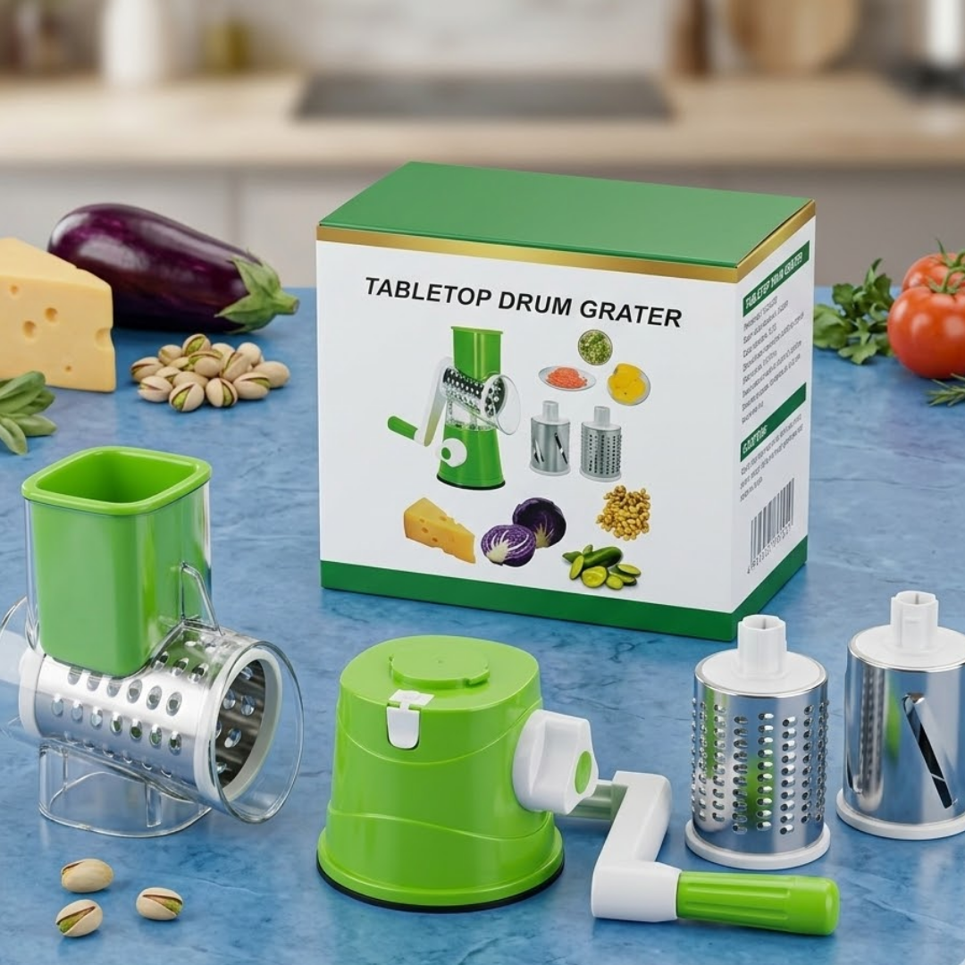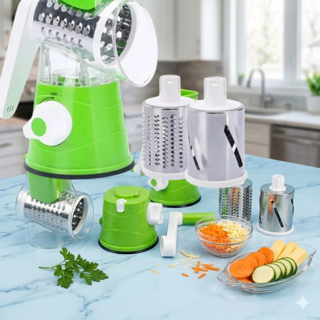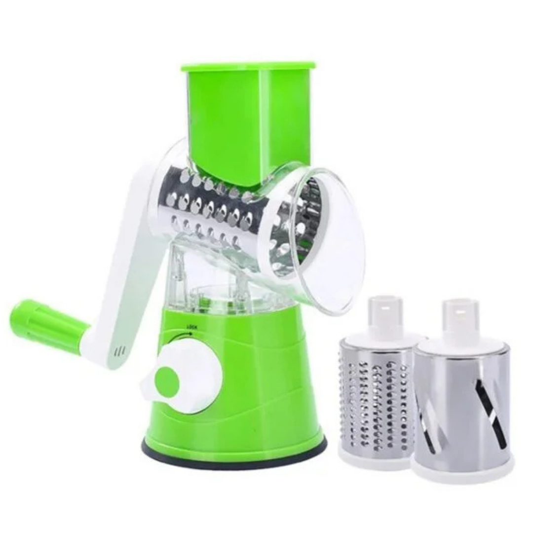Manual 3‑in‑1 vegetable cutter & slicerIncludes drum grater & chopper bladesRound slicer design for easy use. Multifunctional – slice, grate & chopDurable and easy to cleanCompact table‑top kitchen gadget